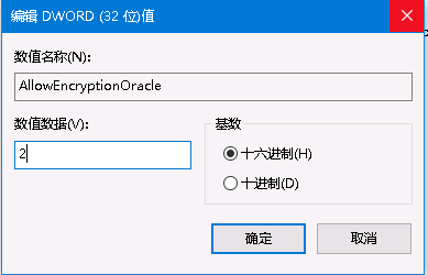 双击该值,基数选择「十进制」,数值数据填写「2」(2代表“易受攻击”模式,临时兼容旧策略);