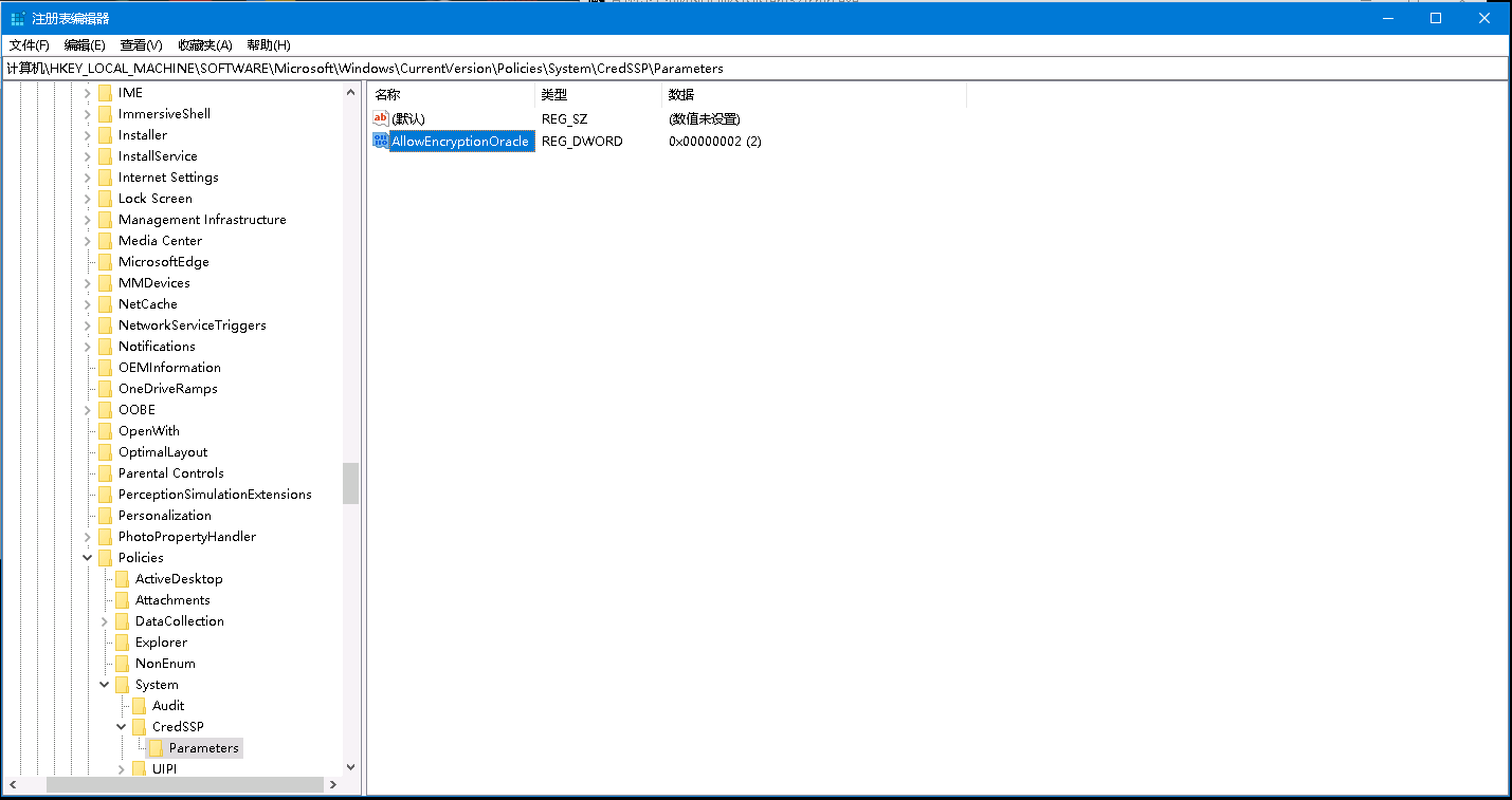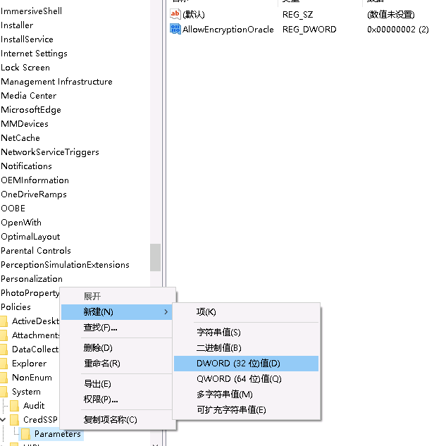 右键「Parameters」→ 新建 → DWORD(32)位值,命名为「AllowEncryptionOracle」;