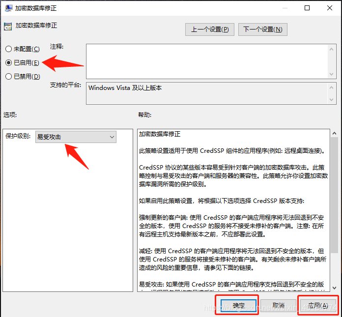 双击“加密Oracle修正”策略,选择「已启用」,在“保护级别”下拉框中设置为「易受攻击」;